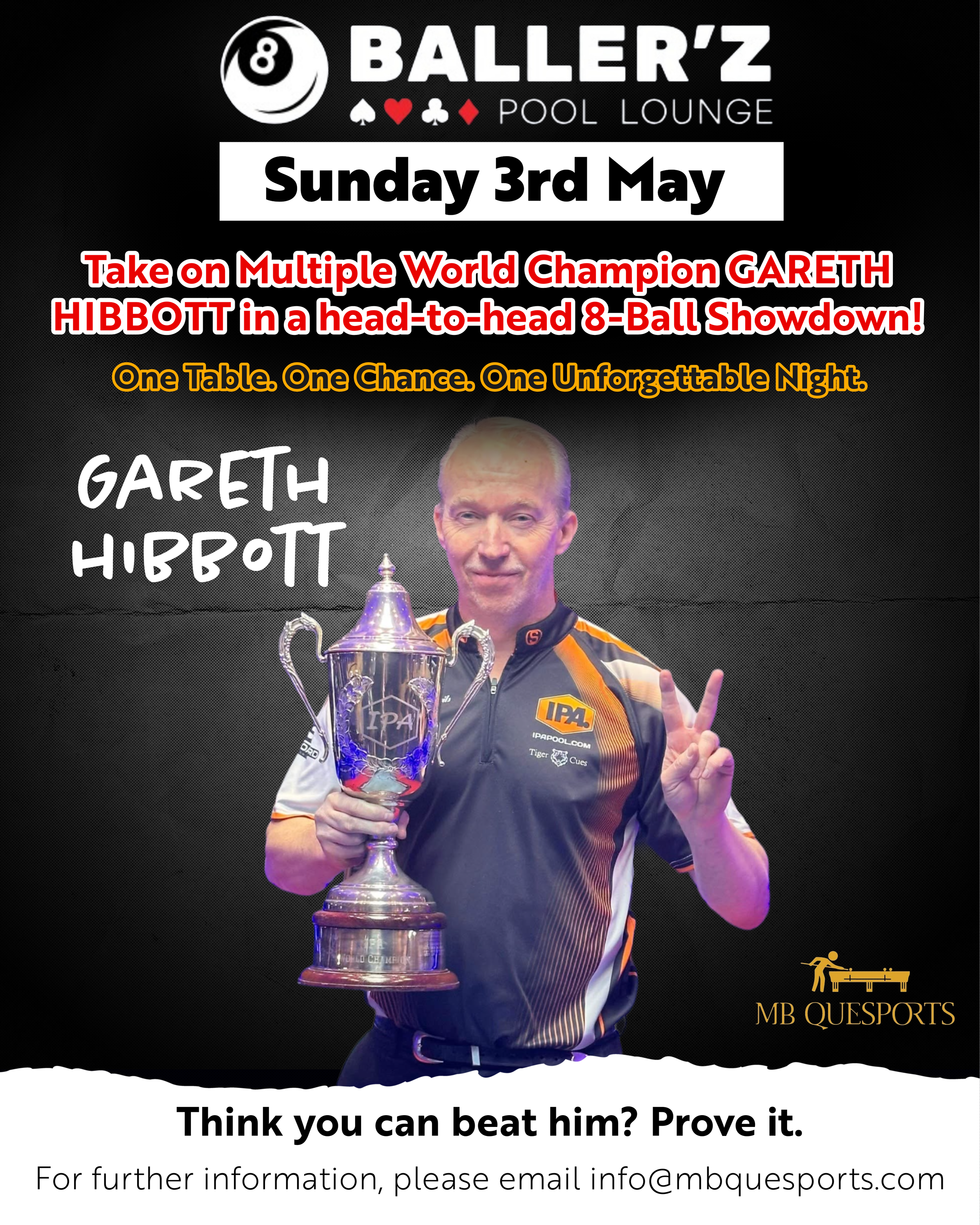 Take on multiple world champion Gareth Hibbott in a head-to-head match for your chance to beat the pro— grab raffle tickets on the night for the chance to play or secure a limited premium spot to guarantee your game, with all players receiving a signed photo and donations will be made to charity.